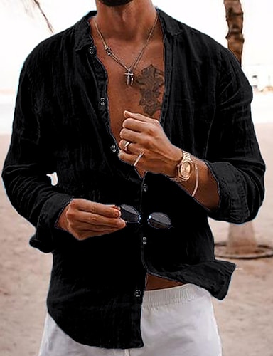 Homens Camisa Social Camisa de linho camisa de verão Roupa de Praia Tecido Férias Casual Preto Branco Azul Verde Manga Longa Lapela Verão Primavera Roupa Puro