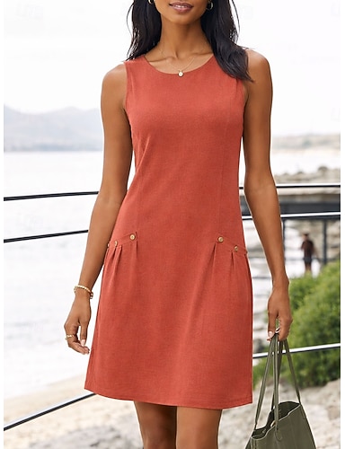 Vestido midi feminino em imitação de algodão e linho, modelo reto, ideal para o verão, casual, para uso diário, modelagem regular, liso, sem mangas, gola redonda, nas cores azul, laranja e verde.