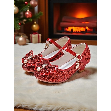 Sapatinhos Mary Jane rosa com glitter e laço para crianças - perfeitos para festas de Natal e comemorações de fim de ano.