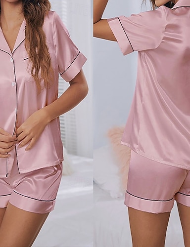 Mulheres Loungewear Conjunto de Pijama Moda Casual Macia Cor imaculada Patchwork Cintura elástica Botões Calção Casa Férias Manga Curta Lapela Rosa Claro Preto Branco Champanhe Rosa Verão Primavera