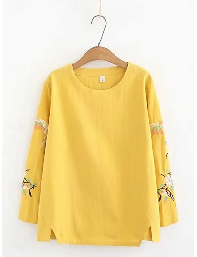 Mulheres Camiseta T-shirt Bordado Floral Moda Clássico Casual Manga Longa Gola Redonda Tops regulares Diário Para Noite Final de semana Branco Amarelo Azul Marinha Verão Primavera Outono