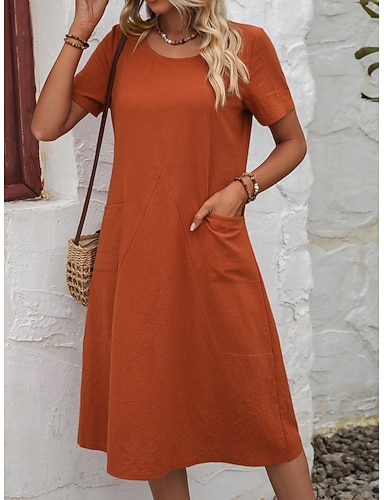 Vestido midi feminino em imitação de algodão e linho, modelo evasê, ideal para o verão, casual, solto, liso, manga curta, gola redonda, nas cores preto, laranja, verde militar e damasco.