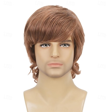 Peruca masculina curta e ondulada, peruca marrom, estilo roqueiro, para festa de Halloween e cosplay, anos 60 e 70