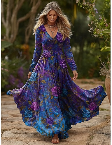 Vestido Maxi de Mulheres Boho Vestido Plissado Festa Casual Diário Encontro Saindo Ajuste Regular Gráfico Floral Manga Longa Decote em V Azul Fúcsia Primavera Outono Inverno