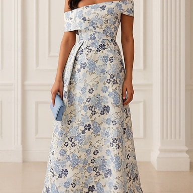 Linha A Longo Vestidos de noite Vestido de Baile Elegante Vintage Floral Meia Manga Decote Canoa Festa de Jardim Casamento Bolsos Cetim com Estampa floral Pregas Bolsos