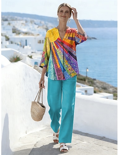 Mulheres Conjuntos de duas peças Conjuntos de calças Bolero Top Manga 3/4 Decote V Gráfico Geométrica Imprimir Diário à moda Casual Diário Praia Azul Amarelo Roxo Verão Ajuste Largo