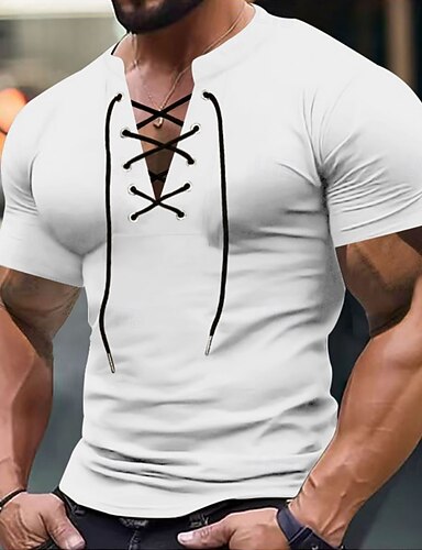 Homens Camiseta T-shirt Manga Curta Pescoço Laço Verão Tecido Roupa de rua à moda Lazer Cordões Casual Diário Ao ar livre Azul Preto Branco Top Tee para Homens