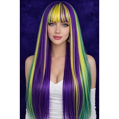 Peruca de carnaval longa e lisa, com as cores do arco-íris, sintética, para festivais, desfiles de Mardi Gras e fantasias de cosplay.