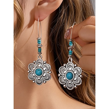 Brincos pendentes de flores boêmios femininos com pedra turquesa, brincos de liga vintage para uso casual, praia e festas