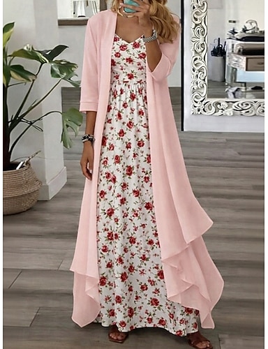 Mulheres Vestido Longo Vestido casual Conjunto de vestido Vestido de chiffon Vestido floral Elegante Moda Moderno Ao ar livre Férias Para Noite Normal Floral Manga 3/4 Decote V Rosa Verão Primavera