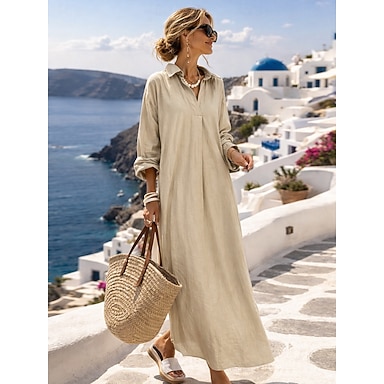 Mulheres Vestido Longo Vestido Maxi Linho de algodão sintético Vestido de turno Camisetão Vestido de verão à moda Casual Diário Férias Encontro Normal Tecido Manga Longa Lapela Preto Vinho cáqui