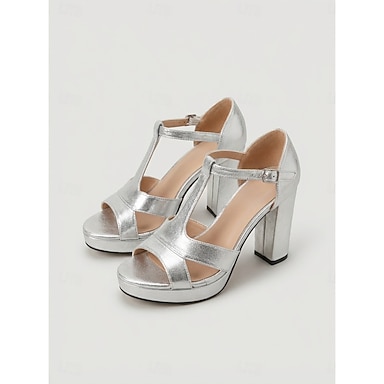 Sandálias femininas prateadas com plataforma e salto bloco, sapatos de salto grosso com tira em T para festas de coquetel e formaturas. &eventos noturnos
