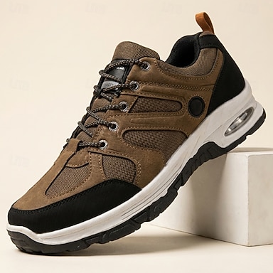 Tênis masculino marrom para atividades ao ar livre, com cadarço, leve e confortável, ideal para caminhadas, viagens, lazer ao ar livre, atividades de fim de semana e uso diário.
