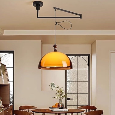 Luminária pendente tradicional vintage semicircular de acrílico, madeira e metal com braço articulado, para sala de jantar.