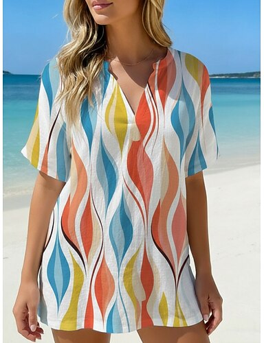 Mulheres Camisa Social Camisa casual camisa de praia Blusa Imprimir Geométrica à moda Clássico Moderno Manga Curta Decote V Tops regulares Diário Feriado Para Noite Azul Azul Céu Azul Claro Verão