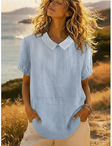 Mulheres Camisa Social Blusa Camisa de algodão Linho de algodão sintético Tecido à moda Clássico Moderno Manga Curta Gola Redonda Tops regulares Diário Feriado Para Noite Branco Rosa Azul Céu Verde