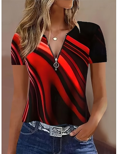 Mulheres Camiseta Bloco de cor Quarter Zip Gráfico Geométrica Tropical Moda Havaiana Manga Curta Gola Redonda Tops regulares casamento na praia Diário Esportes Amarelo Vermelho Verão Primavera