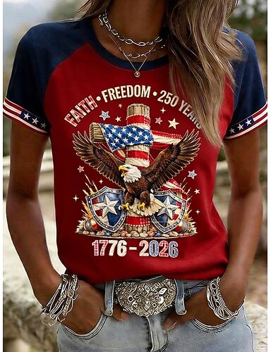 Dia da Independência Americana Mulheres Camiseta Imprimir Gráfico Bandeira à moda Clássico Casual Manga Curta Gola Redonda Decote Redondo Tops regulares Diário Azul Preto Vermelho Verão Primavera