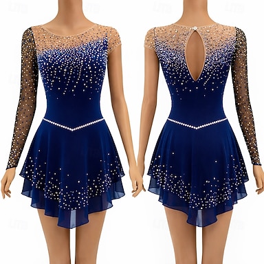 Vestidos para Patinação Artística Mulheres Patinação no Gelo Vestidos Azul marinho Patchwork Sem costas Elastano Com Transparência Elasticidade Alta Treino Competição Roupa para Patinação Clássico