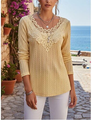 Mulheres Camisa Social Blusa Tops de renda Blusas de manga comprida Renda Patchwork Tecido à moda Básico Clássico Manga Longa Gola Redonda Tops regulares Diário Feriado Para Noite Damasco Verão