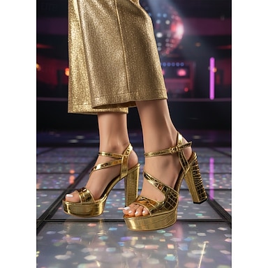 Sandálias plataforma douradas glamorosas estilo discoteca dos anos 70 para mulheres - sandálias robustas com estampa de crocodilo metálica e tira no tornozelo, perfeitas para festas retrô e baladas.