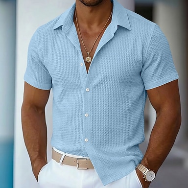 Homens Camisa Social Camisa Waffle Textura Camisa casual camisa de botão Azul Preto Branco Rosa Caqui Manga Curta Tecido Lapela Casual Diário Roupa Moda Moderno Casual Confortável