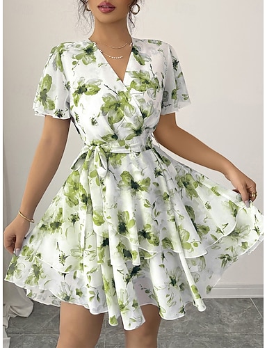 Mulheres Vestido no Joelho Vestido de chiffon Vestido floral Vestido estampado Moda Moderno Ao ar livre Férias Para Noite Normal Floral Manga Curta Decote V Azul Vermelho Verde Verão Primavera