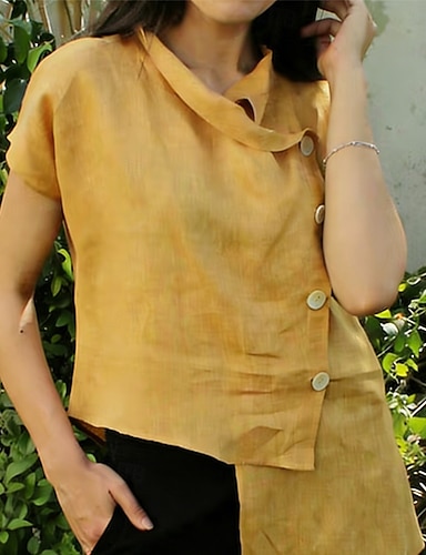 Mulheres Camisa de linho camisa de verão camisa de botão Linho de algodão sintético Franzido Botões Barra Assimétrica Côr Sólida Tecido Elegante à moda Casual Manga Curta Decote V Tops longos Diário