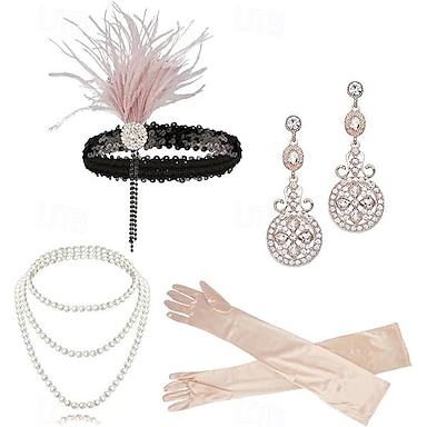 Anos 20 Faixa De Cabelo Estilo Melindrosa O Grande Gatsby Sem Colarinho Fantasia Mulheres Carnaval Baile de Máscaras Festa Mascarilha Adulto 1 Par de Brincos 1 Bracelete Luvas Todas as Estações