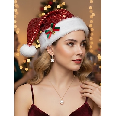 chapéu de papai noel feminino com lantejoulas, laço festivo e sino, acabamento em pele, acessório para festa de fim de ano