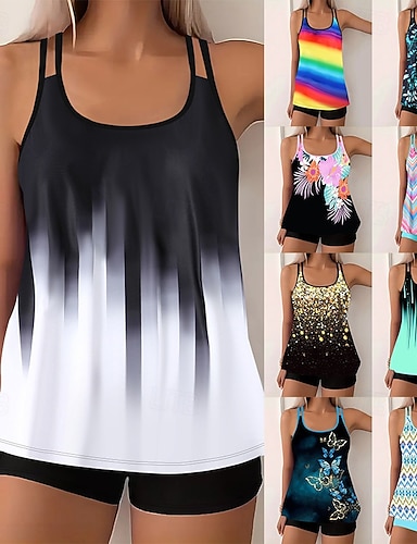 Tankini Feminino de 2 Peças Maiô Com Aro Colorblock Cheeky Controle de Barriga Alta Slim Sem Costas Férias Praia Vestuário Floral Listrado Sem Alças Sem Mangas