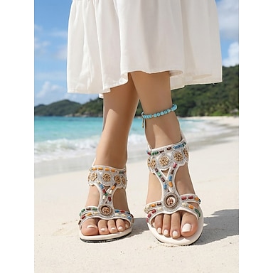 Sandálias femininas brancas elegantes com tira em T - chinelos confortáveis com detalhes brilhantes de cristais, perfeitas para férias em ilhas e resorts de praia. &look boho chic de verão