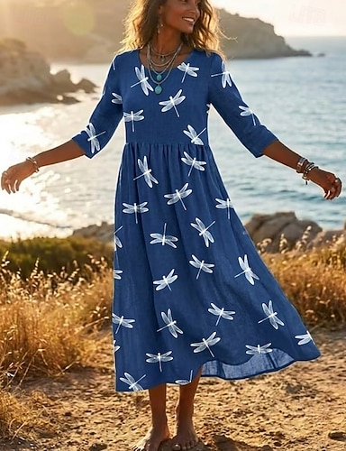 Mulheres Vestido midi Vestido casual Vestido de verão Moda Moderno Diário Praia Final de semana Normal Animal Flor Meia Manga Gola Redonda Roxo Claro Azul Escuro Primavera Outono