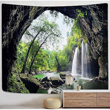 Tapeçaria de parede com paisagem natural, cachoeira e caverna, floresta tropical, arte para sala de estar, quarto e decoração de casa.