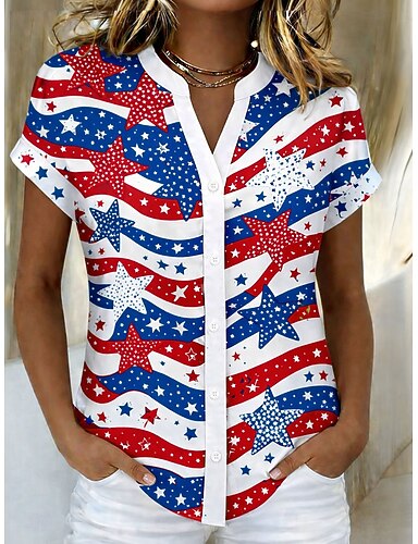 Dia da Independência Americana Mulheres Blusa Botões Imprimir Gráfico Geométrica Estrela Vintage à moda Casual Manga Curta Decote V Tops regulares Diário Rosa Vermelho Laranja Verão Primavera
