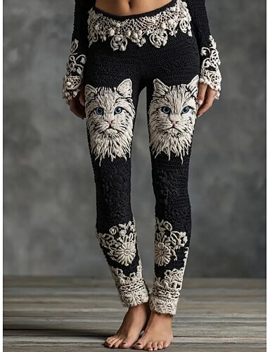 Mulheres Leggings Leggings aconchegantes Moda Roupa de rua Básico Comprimento total Cintura AltaPantsNatal Gráfico Gato Estampado Tosão Térmico / Quente Confortável Com Stretch Ao ar livre Casual