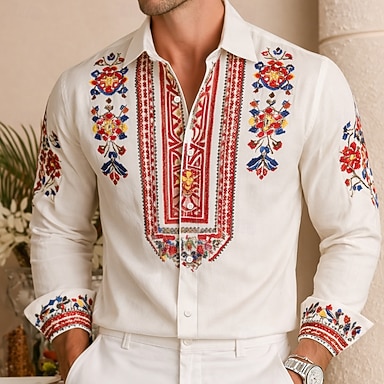Homens Étnico Floral Intrincado Flores Camisa Social camisa de botão Manga Longa Vintage retrô Casual Ao ar livre Feriado Primavera Outono Aberto para a Lateral Impressão 3D Camisa tipo linho Azul