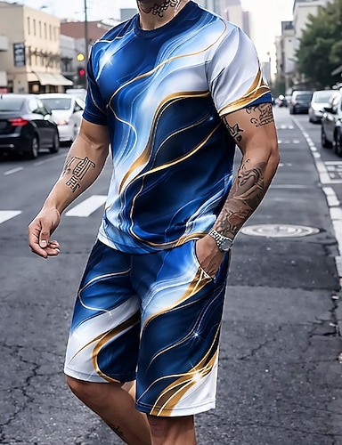 Homens Geométrico 2pcs Conjuntos de camisetas Tops de verão Manga Curta Calças curtas Gola Redonda Casual Na moda Estilo de rua Casual Diário Férias Impressão 3D Verão Azul Vermelho Roxo