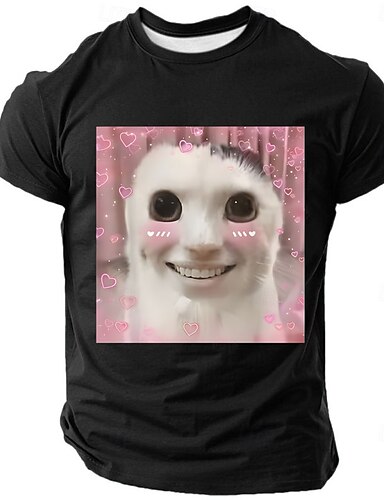 Camiseta masculina com estampa de gato sorridente e coração rosa, estilo streetwear kawaii, modelagem regular, para uso diário, disponível nos tamanhos P, M, G, GG, XGG e XXGG.