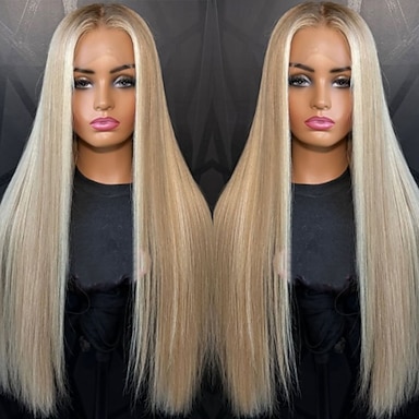 Peruca de cabelo humano brasileiro Remy 100% natural, sem cola, com fecho de renda 5x5 e frontal de renda 13x4, cor loiro acinzentado liso com baby hair, efeito ombré, mechas coloridas e pré-desfiada