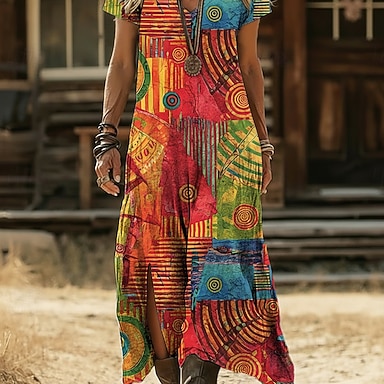 Mulheres Vestido midi Vestido Boho Vestido casual Vestido A Line Vestido estampado Vintage Ao ar livre Férias Final de semana Ajuste Largo Gráfico Bloco de cor Manga Curta Decote V Fúcsia Verão