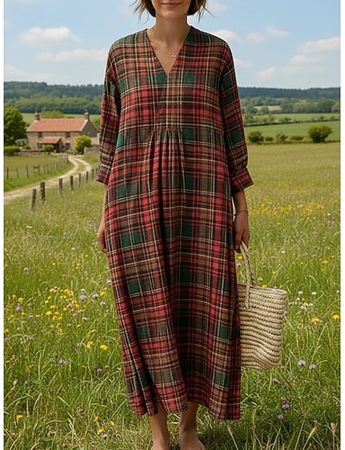 Mulheres Vestido midi Vestido casual Vestido de turno Vintage Diário Ao ar livre Férias Ajuste Largo Xadrez Manga Longa Decote V Vinho Verão Primavera Outono