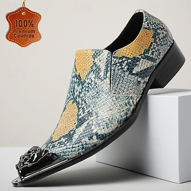 Sapatos masculinos de couro com estampa de cobra exótica e acabamento brilhante – calçados de luxo de grife para festas noturnas e eventos VIP.
