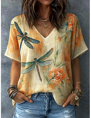 Mulheres Camiseta Imprimir Floral Gráfico Vintage à moda Clássico Manga Curta Decote V Tops regulares Casual Diário Final de semana Azul Amarelo Rosa Roxo Verde Verão Primavera