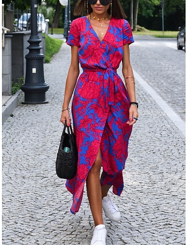 Linha A Longo Vestido de convidada de casamento Vestido formal Vestido de noite Vestidos de baile Elegante Manga Curta Decote V Formal Convidado do casamento Chiffon com Estampa floral