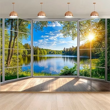 Tapeçaria de parede com vista para o lago e janela, paisagem natural, floresta e luz solar, ideal para decoração de quarto, sala de estar, dormitório e casa.