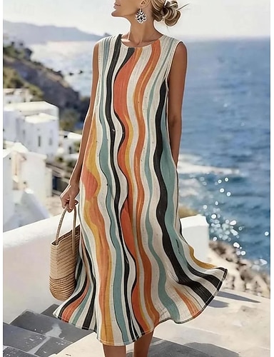Mulheres Vestido midi Vestidos Para o Verão Vestido de turno Férias Casual Estilo Praia Praia Para Noite Ajuste Largo Gráfico Geométrica Sem Manga Crewneck Amarelo Claro Laranja Verde Verão Primavera