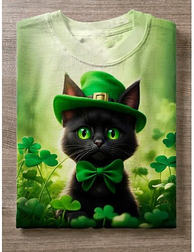 Camisa Feminina do Dia de São Patrício com Estampa Gráfica de Gato Trevo Vintage Estilo Clássico Manga Curta Decote Redondo Tops Regulares Impressão Diária Verde Claro Verde Verão Primavera