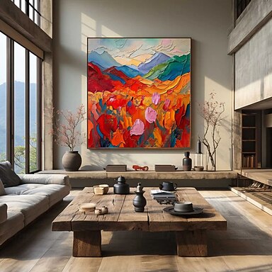 Pintura a óleo pintada à mão, paisagem floral abstrata pintada à mão em tela, arte de parede grande, arte original e colorida de montanha, decoração de primavera, decoração moderna para sala de estar
