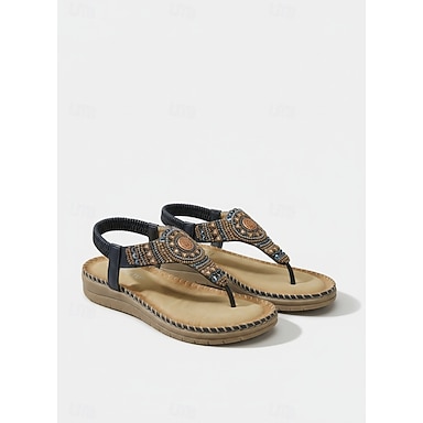 sandálias femininas com tiras em T e contas, com detalhes embelezados e salto anabela confortável – ideais para praia, férias e passeios casuais
